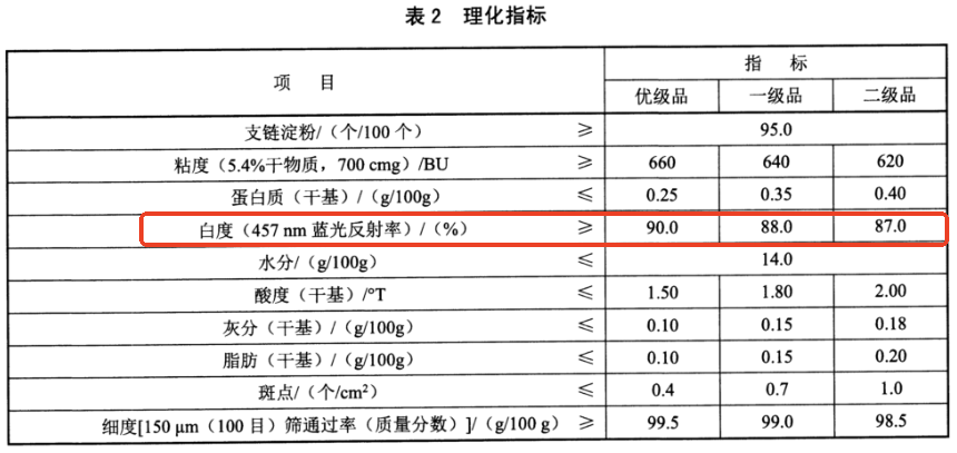 QB/T 5731-2022将糯玉米淀粉分为三个质量等级,每个等级都有明确的白度下限要求。