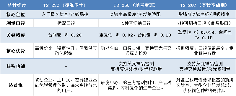 在色彩管理成为产品生命线的今天,选择一台合适的卧式分光测色仪,就像为你的生产线或实验室聘请一位专业的“色彩裁判”。面对三恩时TS-23C、TS-25C、TS-26C这三款明星产品,你是否感到选择困难?别担心,这份指南将化繁为简,帮你快速定位最适合你的那一款。