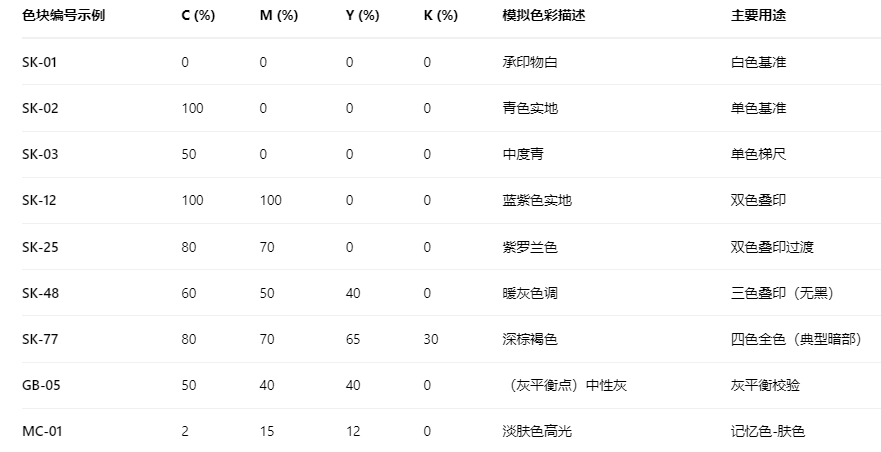 展示每一种油墨(C、M、Y、K)从0%(空白)到100%(实地)以特定步长(如10%)递增的单色梯尺。这是理解油墨特性(如色调、密度)的基础。