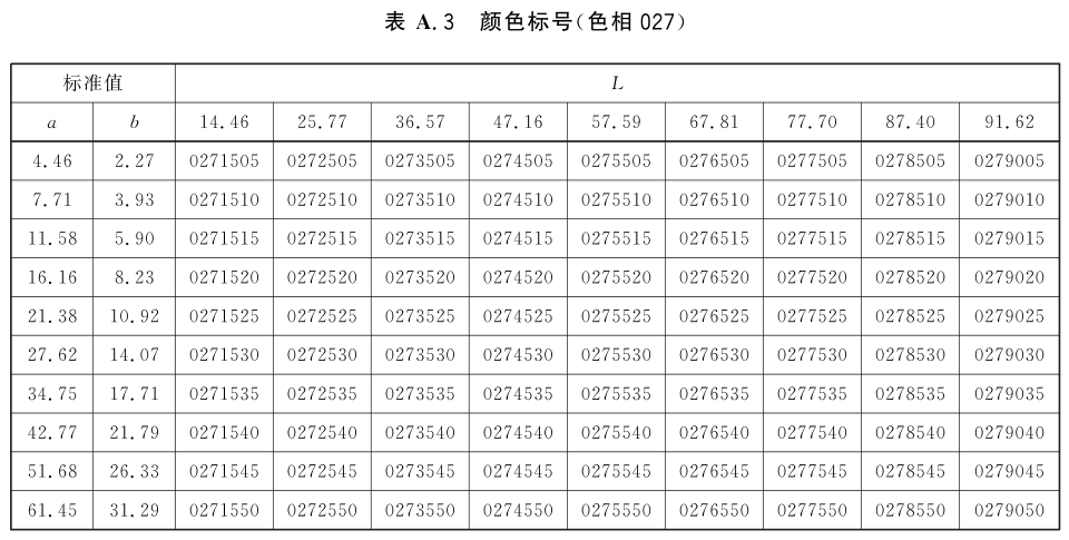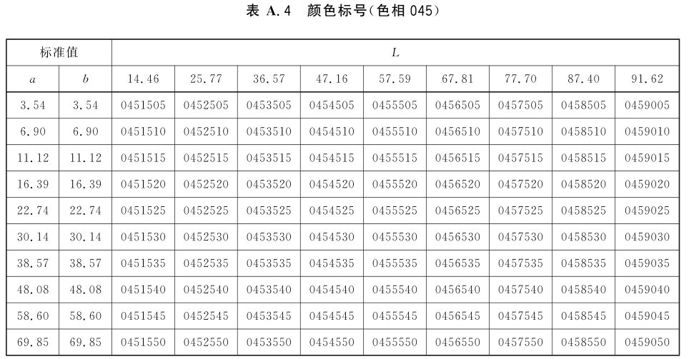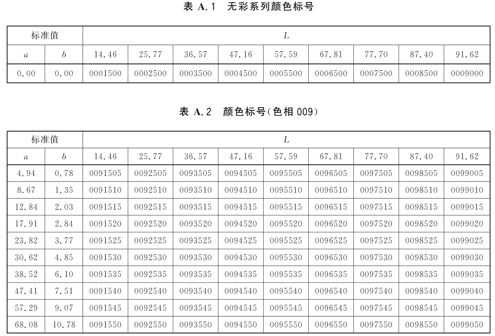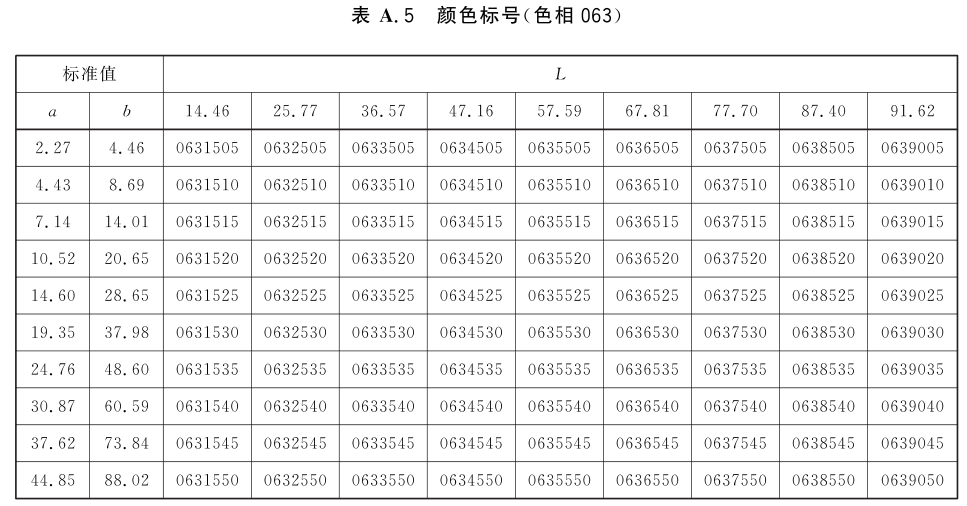 表A.1~表A.24为不同颜色标号与Lab标准色度值的对应关系表。