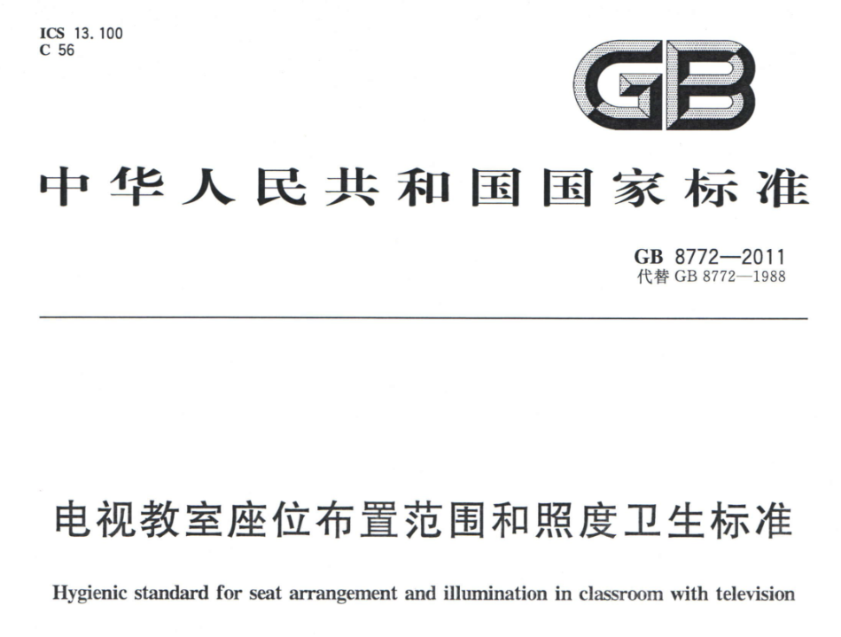 GB 8772-2011是我国针对电视教室(如多媒体教室、电化教室)制定的卫生标准,主要规定了座位布置范围和照度要求,旨在保障学生视力健康,提高教学效果。该标准适用于中小学、高校及职业学校的电视教室设计。