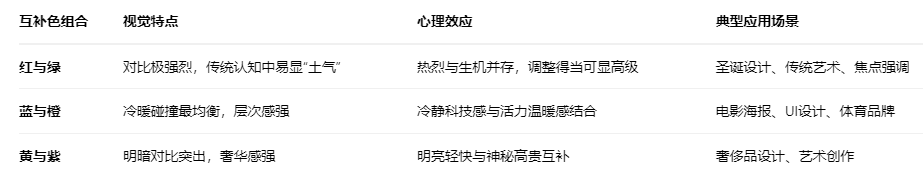 互补色组合具有独特的视觉特性和心理效应,下面通过表格对比主要互补色组合及其特点: