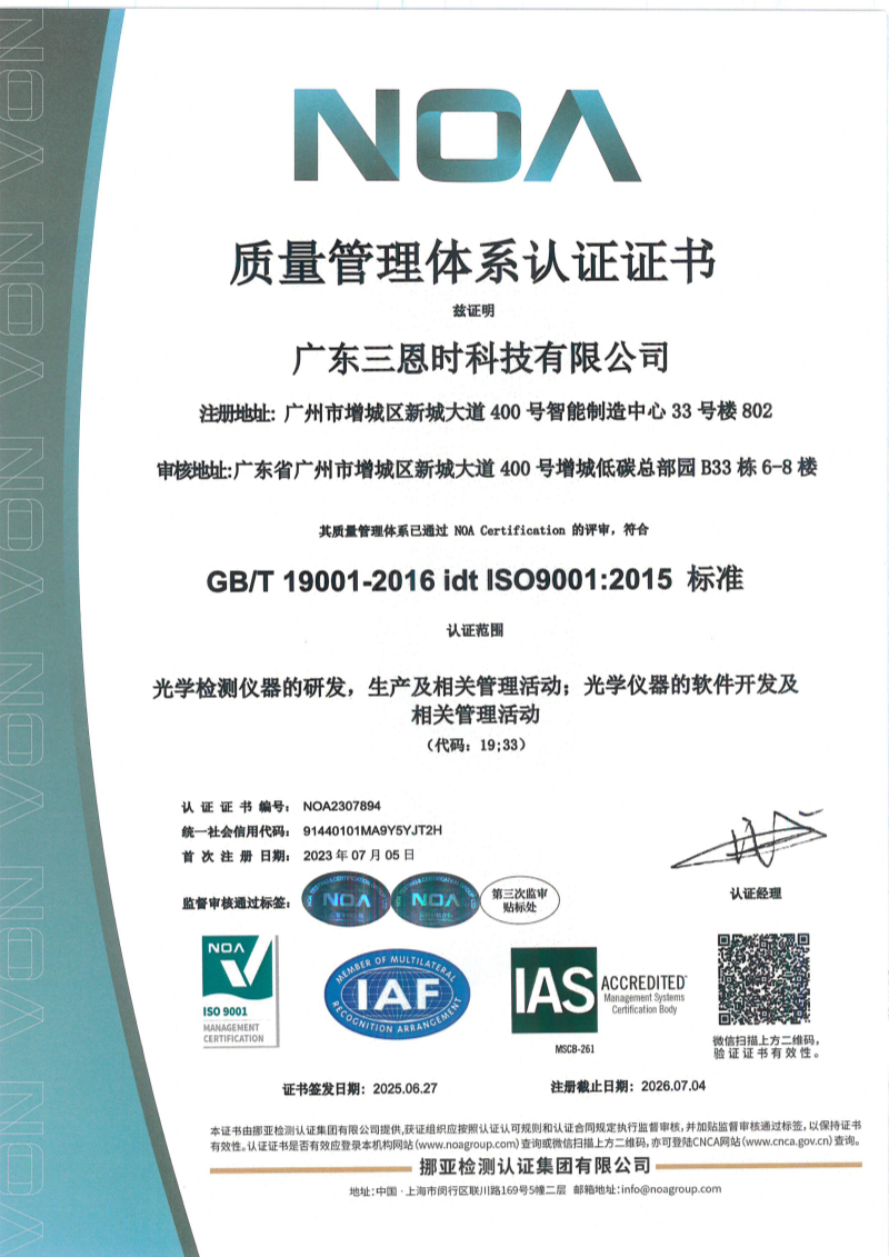广东三恩时再次荣获国际质量体系认证ISO 9001,标志着企业在质量管理领域实现了新的突破。这一认证不仅是权威机构对三恩时质量管理水平的充分肯定,更彰显了企业在色彩测量行业持续领先的硬实力。作为全球公认的质量管理标准,ISO 9001认证代表着企业在新一轮质量管理体系建设中达到了国际标准水平,为行业发展树立了新标杆。