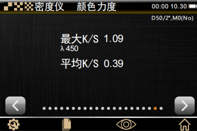 开启密度仪,进入主菜单选择“颜色力度”测量功能。根据测量需求,在设置界面中选择合适的计算模式(最大K/S或平均K/S)和材料类型(透明油墨、不透明油墨或纺织品染料)。这些初始设置是获得准确数据的前提,必须根据实际样品特性仔细选择。