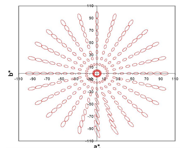 ΔEab公式本质上是将色彩空间视为理想的欧几里得几何空间。但人眼视觉系统并非如此“均匀”: